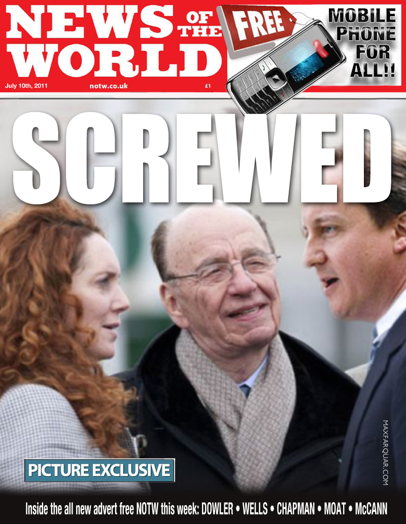 James Murdoch has just announced that this Sunday will see the last ever issue of the News of The Screws. Incredible arrogance of Brooks to close the paper and lay off all her staff before doing the decent thing herself. But hey.